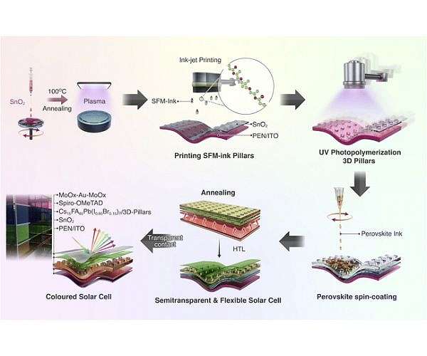 At the core of the design is a pattern of microscopic polymeric pillars created by 3D printing, which form openings that regulate how much light passes through without altering the perovskite absorber layer. The fabrication route avoids high temperatures and toxic solvents, making it compatible with flexible substrates and reducing environmental impact during manufacturing.