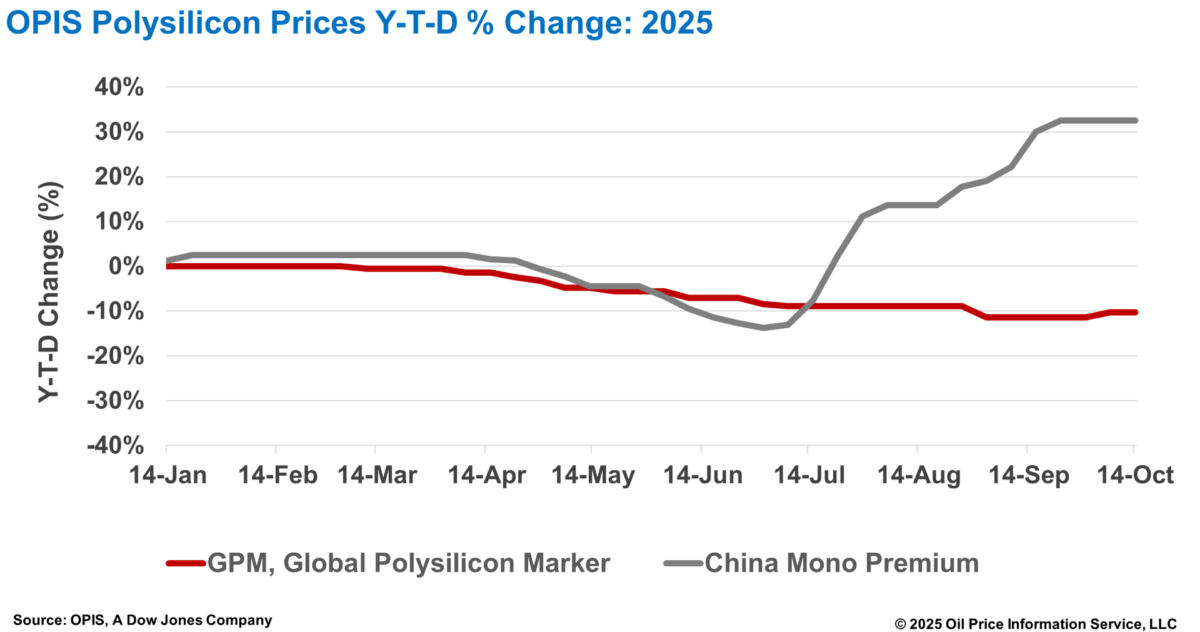 The China Mono Premium—OPIS’ assessment for mono-grade polysilicon used in n-type ingot production—unchanged week-on-week to CNY 52.200 ($7.32)/kg, or CNY 0.110/W, according to the OPIS Global Solar Markets Report released on October 14.