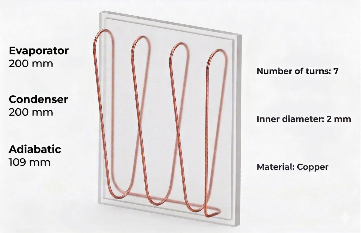 The OHP is a sealed tube in which liquid and vapor naturally move back and forth, carrying heat from a hot area to a cooler one without a pump. In this research, the 3D-OHP was attached to a 50 W PV module, with an efficiency of 13.82%. The cooling device was constructed from red copper tubing, with an internal diameter of 2 mm and an external diameter of 4 mm. It had a 7-turn configuration that comprised three distinct sections: a 200 mm evaporator, a 109 mm adiabatic zone, and a 200 mm condenser.