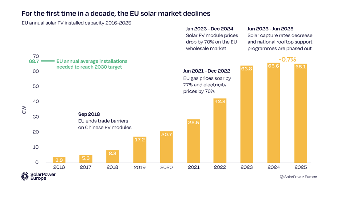 The figure is a 0.7% decrease on the 65.6 GW installed in 2024, the report says, making 2025 the first year since 2016 when less solar was added than the year before.