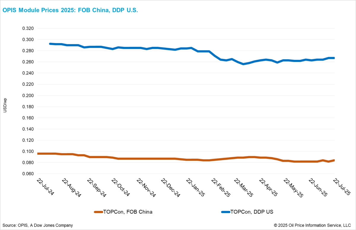 China: According to the OPIS Solar Weekly Report released on July 22, the Chinese Module Marker (CMM), the OPIS benchmark assessment for TOPCon modules from China, rose 2.44% on the week to $0.084/W Free-On-Board (FOB) China, with indications between $0.082-0.087/W. This marks the first increase in FOB China module prices, following upstream price gains that began in the first week of July amid government intervention.