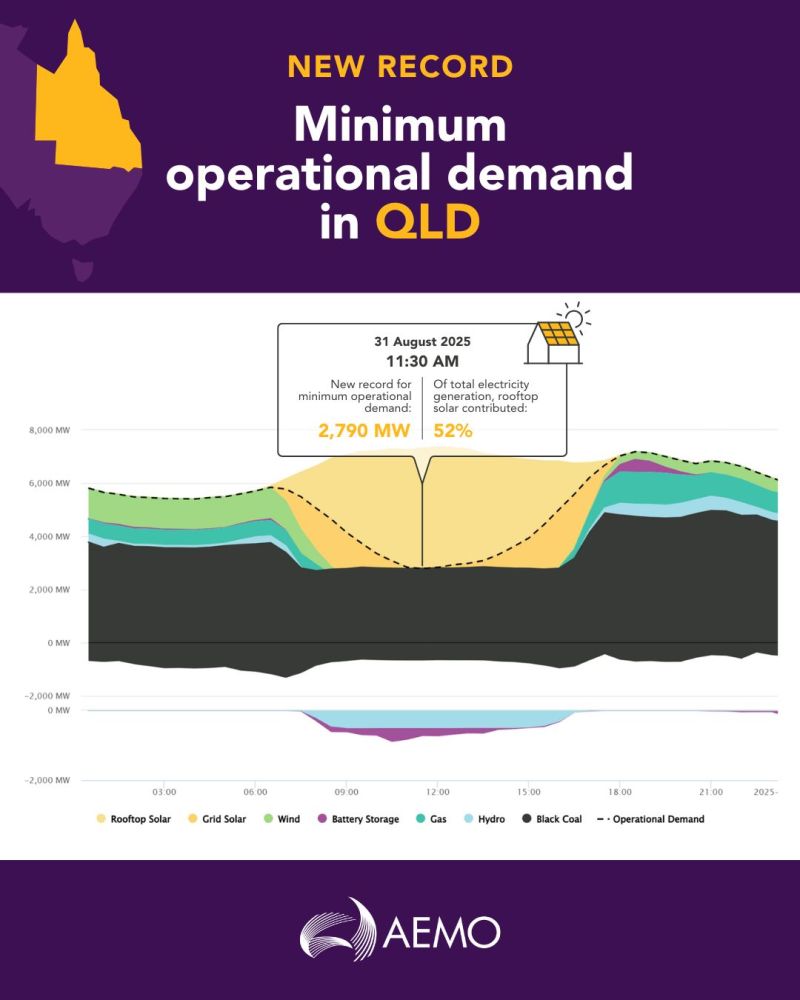 Queensland set back-to-back records for minimum electricity demand from the grid over the weekend, driven by mild weather and strong rooftop solar generation.