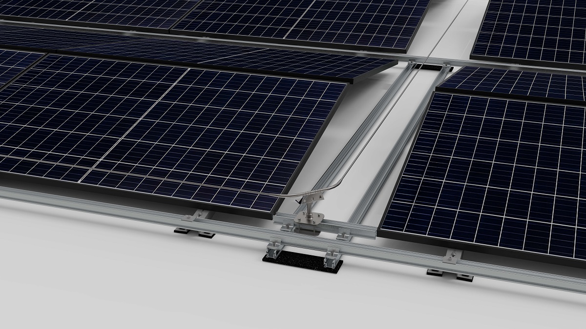 The solution for installers includes substructure, pre-fabricated concrete ballast elements, solar panels at a 10-degree angle in an east-west orientation, and cabling. Design software is also available to support configuration.