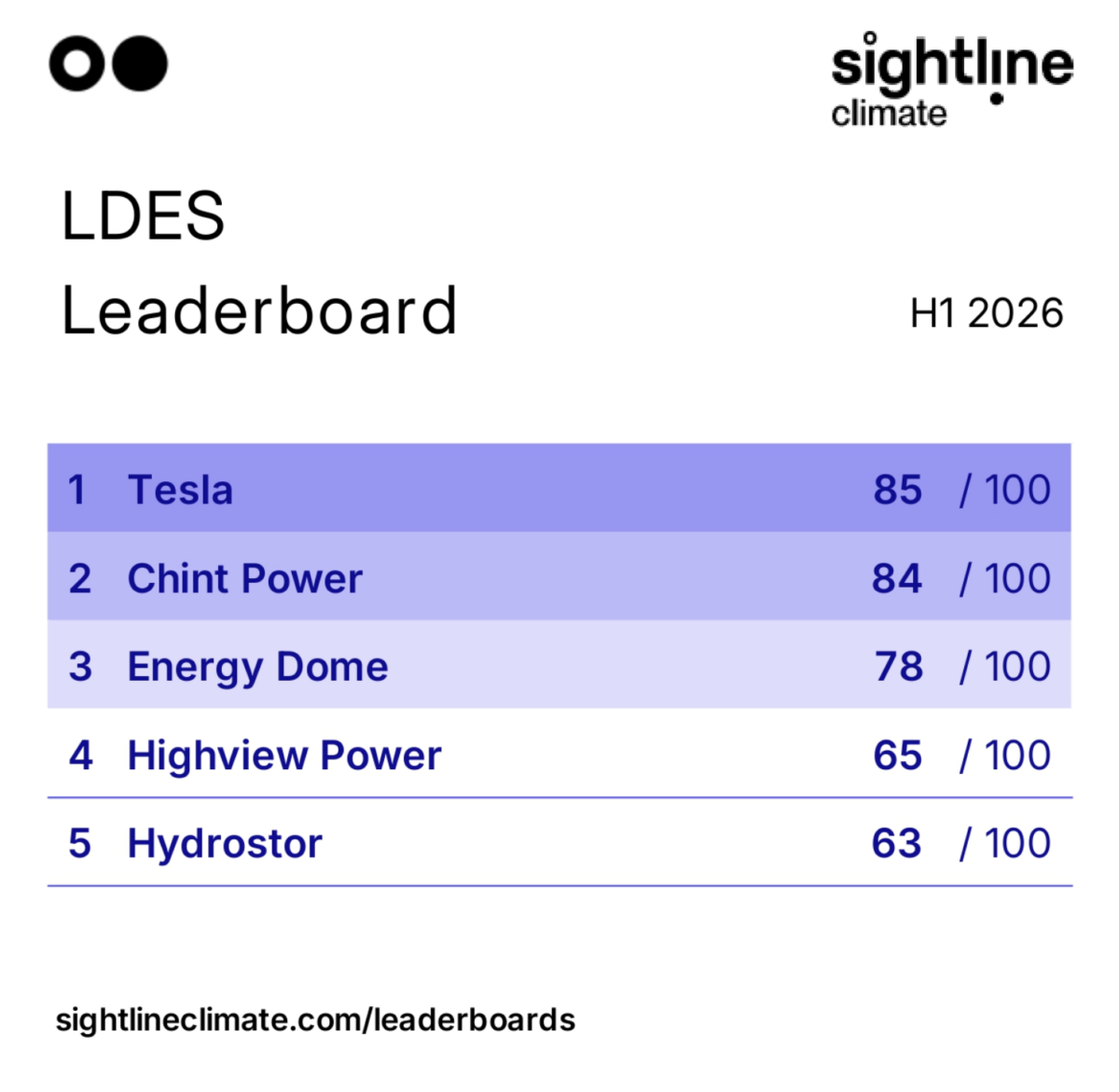 The new leaderboard by Sightline Climate, being developed over the past 15 months, according to the firm, gives a snapshot right now of leaders in LDES across factors including technology performance, financial profile, deployment track record, and economics and cost.